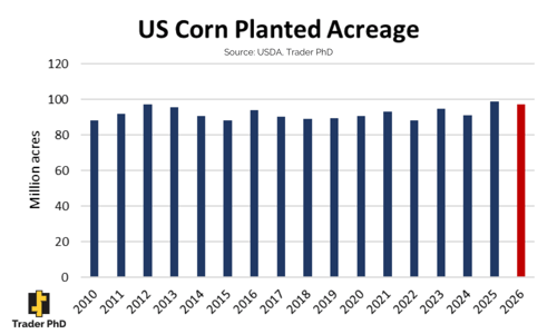 Trader PhD released its February 2026 acreage survey results with the expectation of corn acres normalizing to some extent this season. Sixty-two percent of respondents said their planting decisions were based on their normal crop rotation. Crop prices were the No. 2 reason (18 percent) for planting decisions.