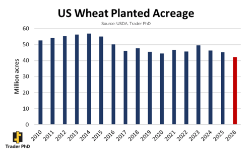 All wheat acreage is seen falling 7.3 percent to 42.2 million acres, the lowest on record for data going back to 1919. U.S. wheat acreage has been trending lower over the past decade. U.S. wheat has struggled to compete in the export market among other global competitors, easily leading to higher stocks.
