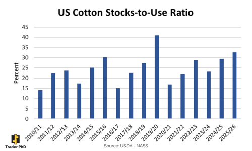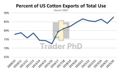 Lower demand has been driving supplies to burdensome levels. Domestically, consumption is the lowest since the 19th century. U.S. cotton demand depends on exports, largely due to overseas manufacturing in the apparel industry and a substantial increase in synthetic fiber usage. Cotton exports are forecast to represent nearly 88 percent of total cotton demand for the current 2025/26 marketing year. That compares to just 79 percent during the 2015/16 season.