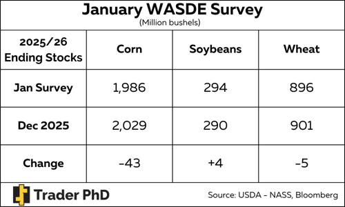 The January WASDE report will likely make final yield and production adjustments for corn and soybeans. A Bloomberg survey of analyst estimates expects the USDA to lower the national average corn yield to 184 bushels per acre (bpa), down 2 bushels from the previous report. On average, analysts expect production to be lowered by nearly 200 million bushels to (still a record) 16.55 billion.